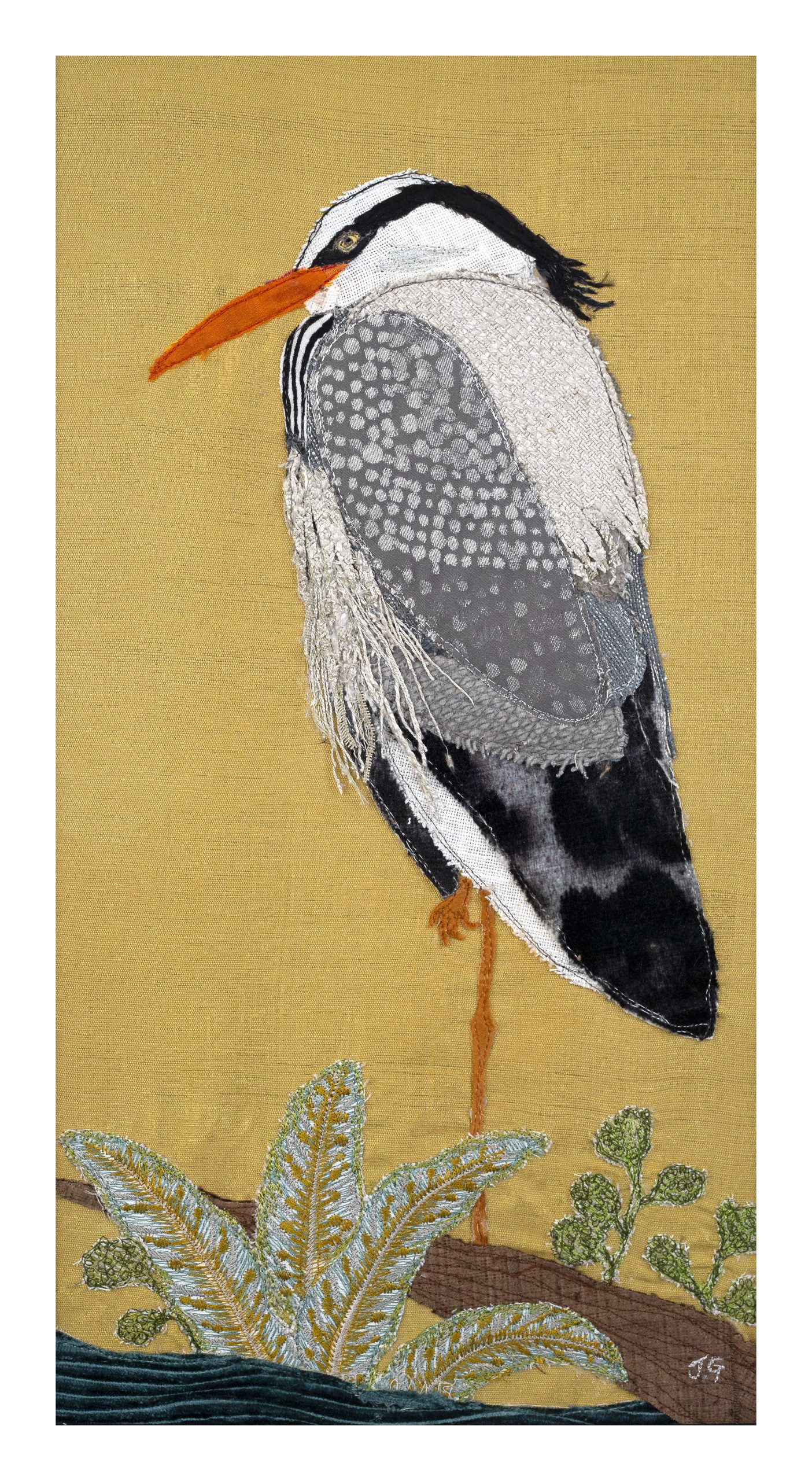 An original textile art piece by Jackie Gale framed with UV Art Glass and a deep and wide black wood frame with a soft white mount and decorative wood insert