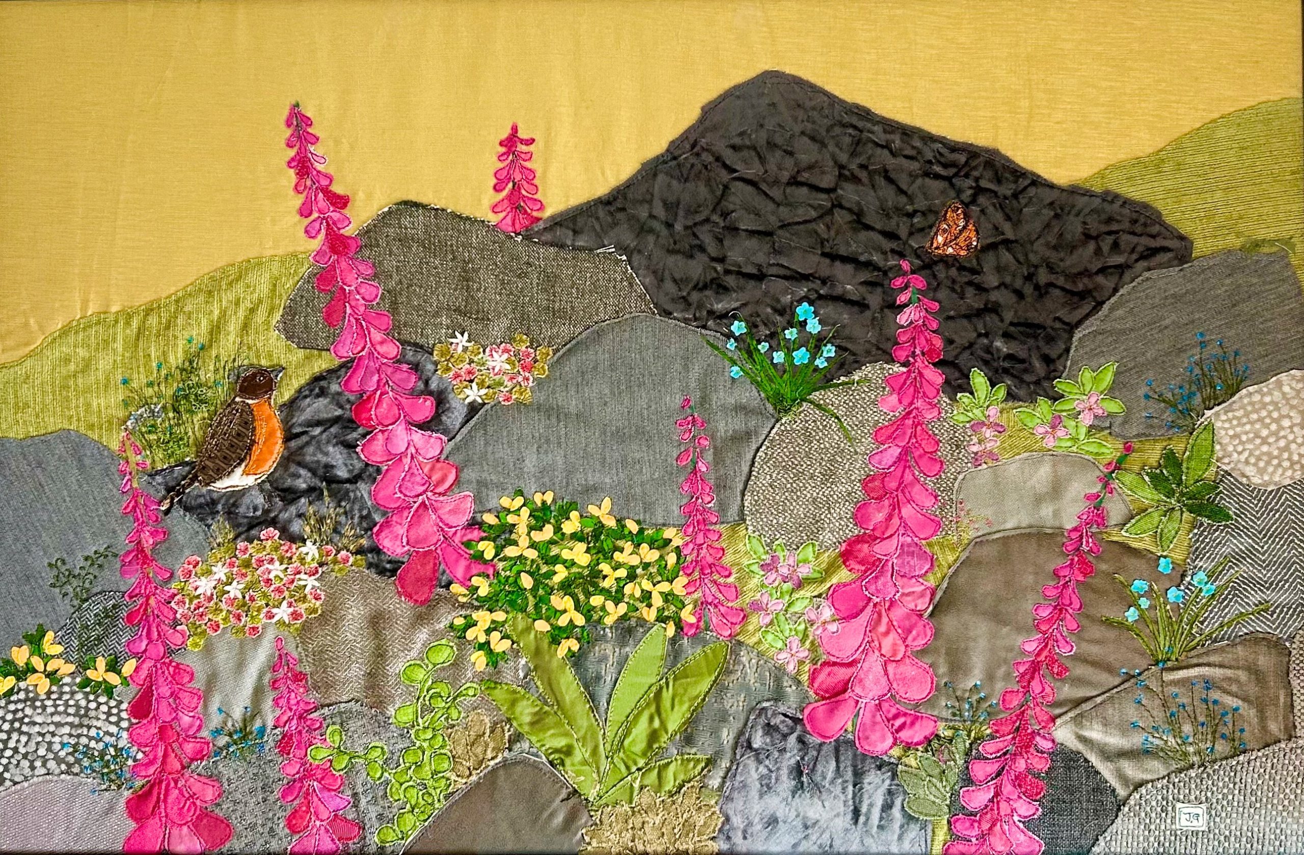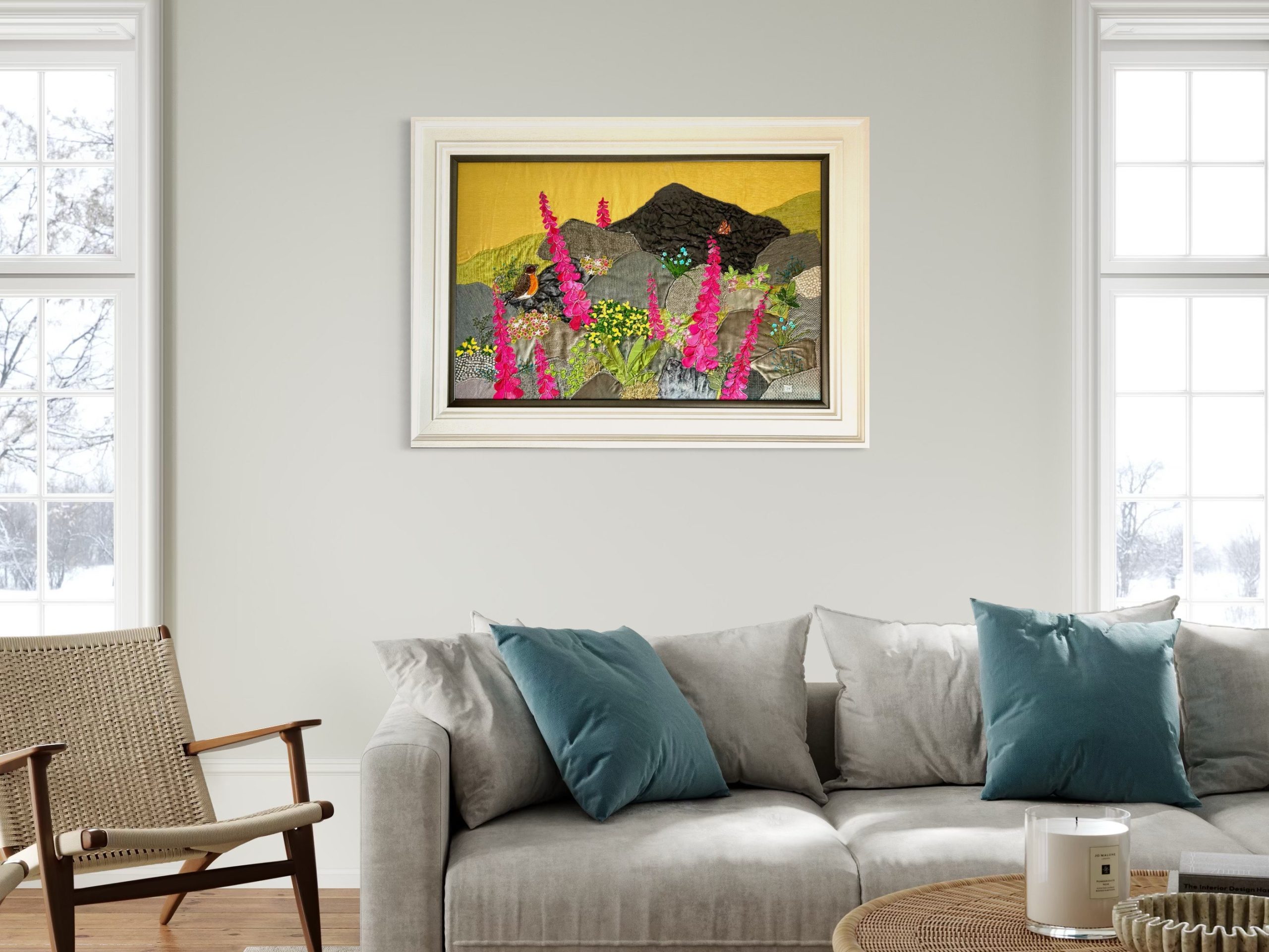 An original textile art piece by Jackie Gale framed with UV Art Glass and a white wood frame, grey wood insert.