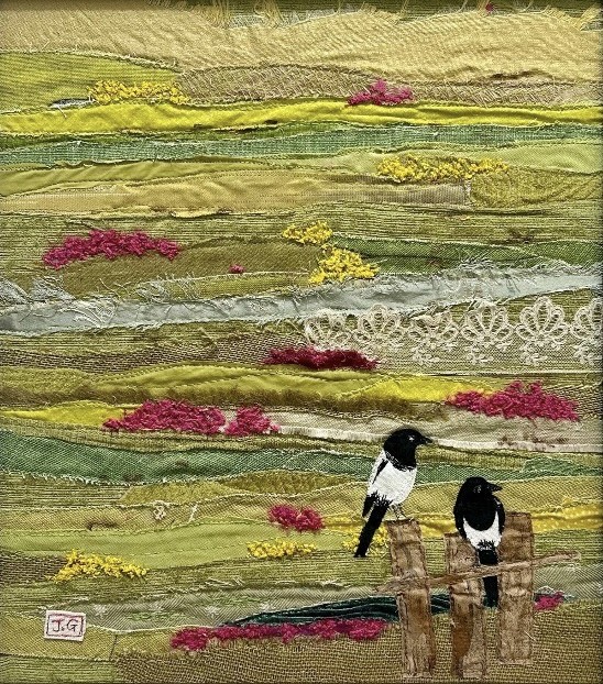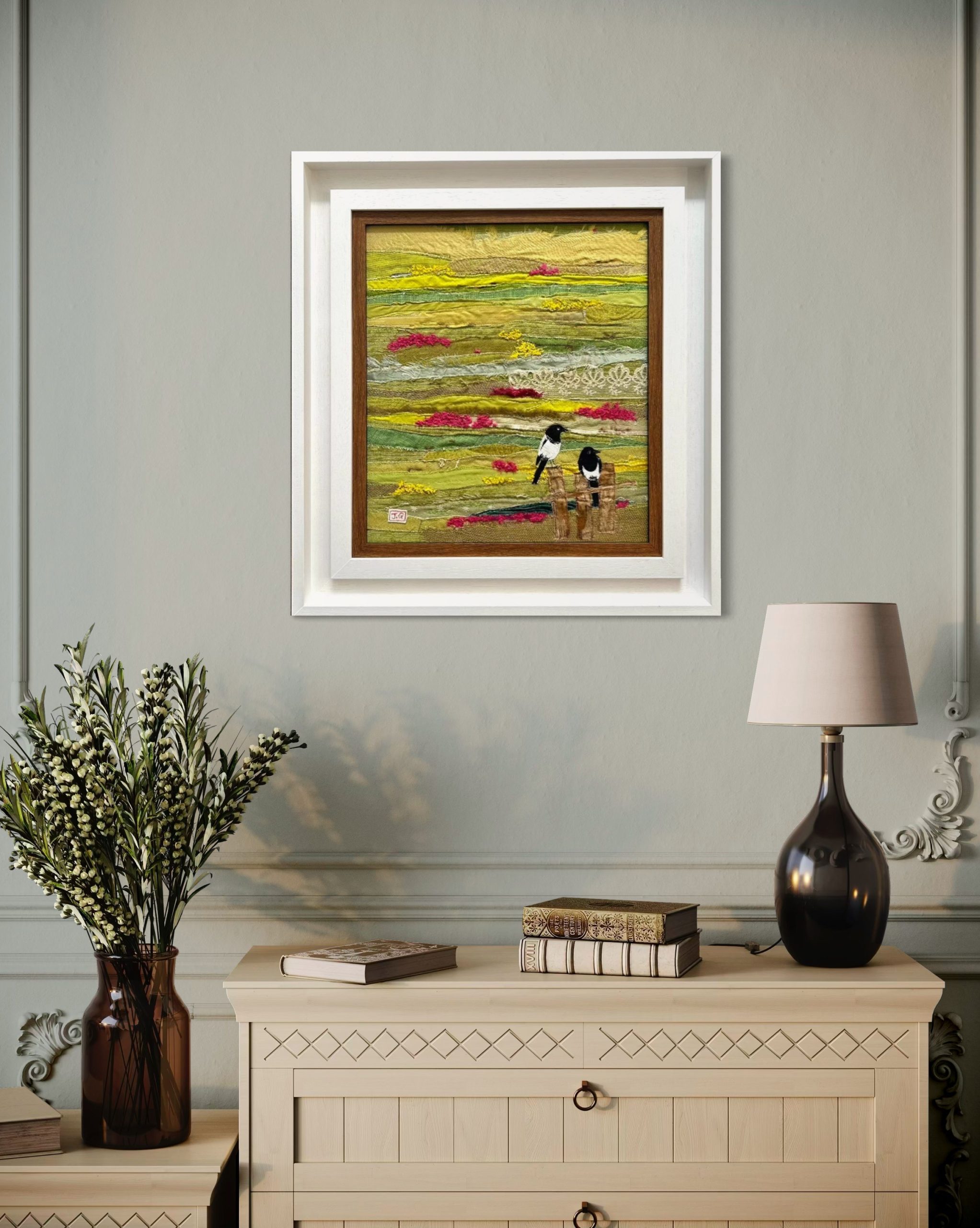 An original textile art piece by Jackie Gale framed with UV Art Glass and a white wood frame and white inner